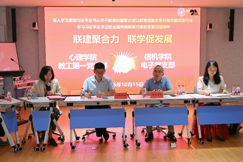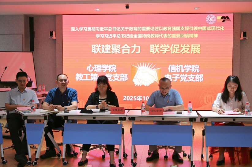 为加强基层党组织建设,推进党建与业务工作深度融合,构建跨领域协同发展新格局,10月15日下午,心理学院教工第一党支部与信息与机电工程学院电子党支部组织的联学共建活动在徐汇校区教苑楼D座401举行。