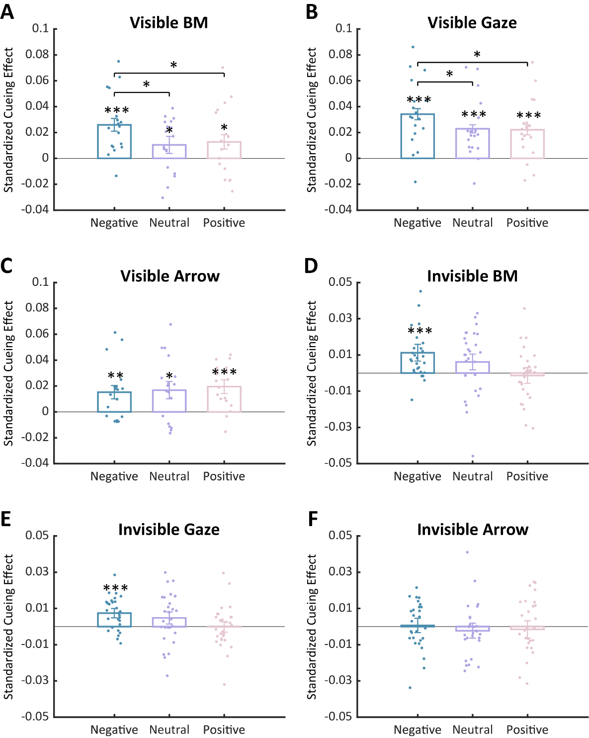 意识上实验结果表明,消极目标特异性增强了生物运动和眼睛注视诱发的注意效应,但这一效应不能拓展至非社会箭头线索诱发的注意效应。意识下实验结果则进一步发现,当且仅当目标为消极时,无意识社会线索(眼睛注视、生物运动)能够诱发显著的注意效应,而这一现象在无意识箭头线索上不存在。