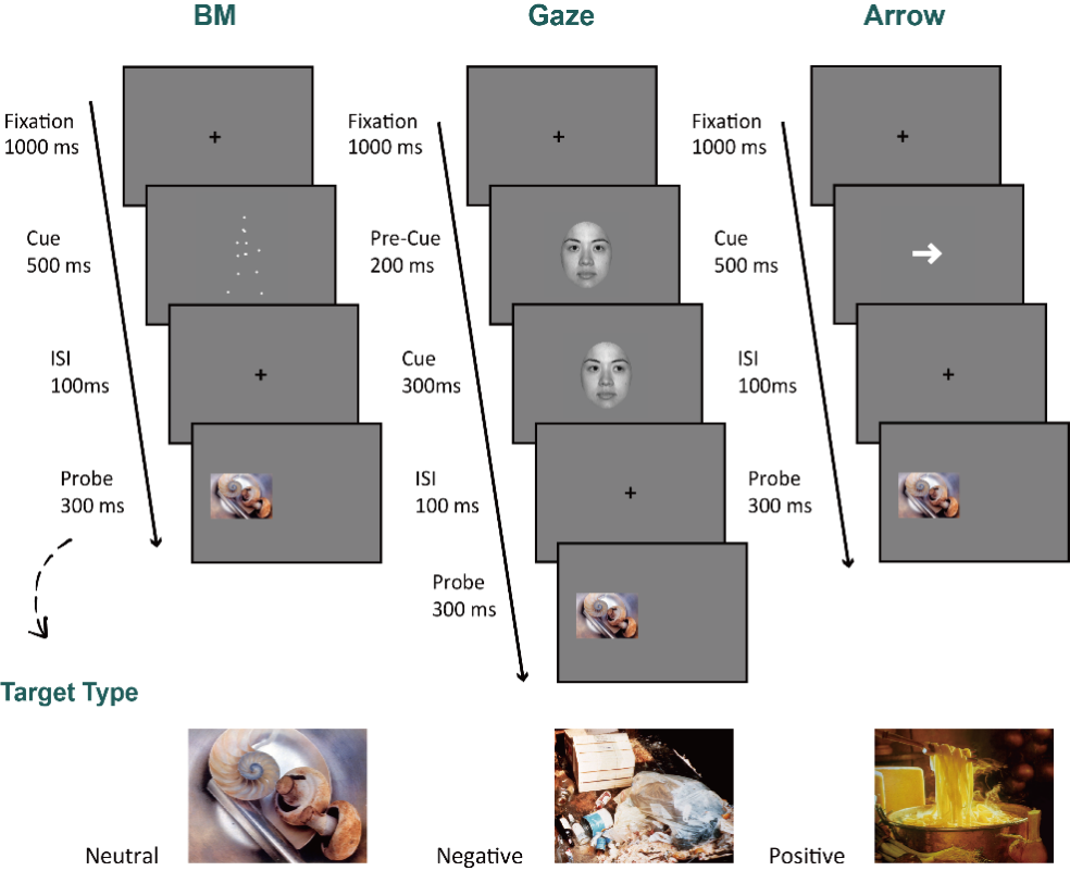 以往研究大多采用无意义的字母或光栅作为社会性注意的探测刺激。然而,在现实生活中,需要探测的事物往往较为复杂且具有一定情绪意义(如奖赏、威胁)。对于这类目标的快速探测具有重要的生存与进化价值。目前,尚不清楚目标情绪内容能否后验地特异性调节社会性注意,及该调节能否拓展到意识下。