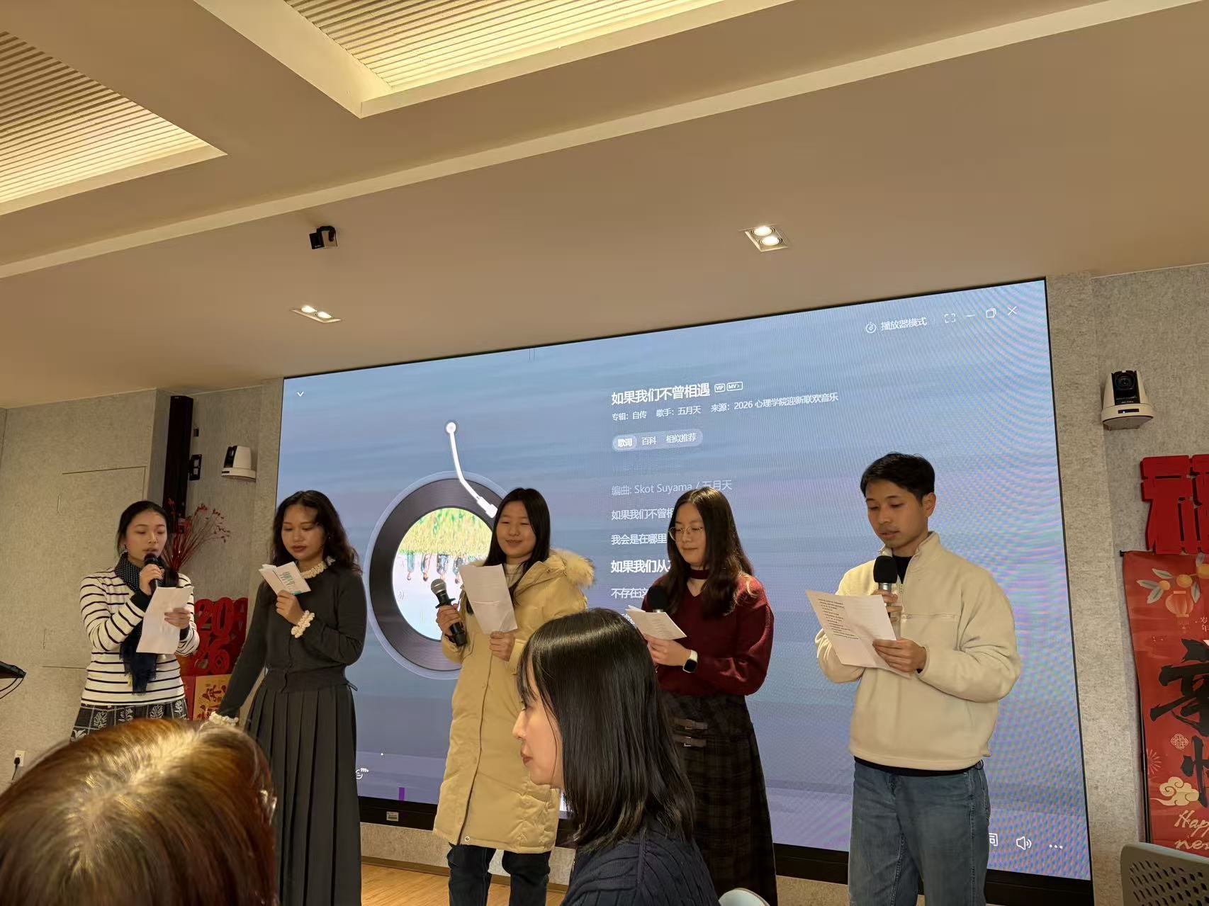 赵明明、黄慧凌、石可、姜梓希、蔡冰灵带来的师生合唱《如果我们不曾相遇》旋律温柔、情感真挚,为联欢会增添了浓浓的温情与感动。
