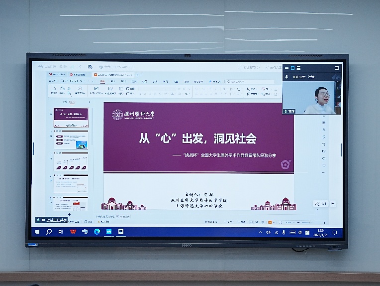会议特邀温州医科大学精神医学学院、上海师范大学心理学院在读博士生贺赫进行“挑战杯”备赛经验分享。贺赫以荣获全国挑战杯特等奖的项目《隐匿的伤痕:生态系统视域下青少年非自杀性自伤行为的实证分析与干预策略》为例,系统阐述了从选题立意、团队组建、调研方法、成果转化到文本打磨与答辩准备的全流程实战经验。她强调,优秀选题应紧扣国家需求、社会关切并具备可操作性,团队需注重专业交叉与能力互补,成果要努力实现学术价值与社会治理实践相结合。其深入浅出的分享为在场师生提供了清晰可行的备赛路线图。