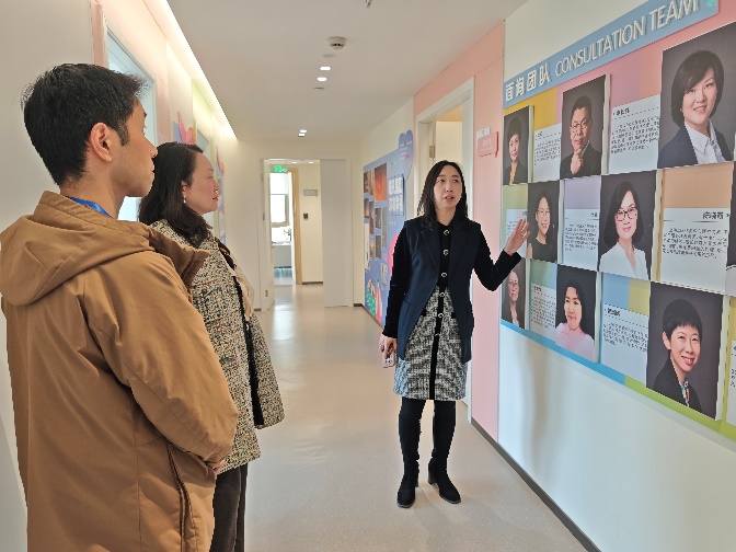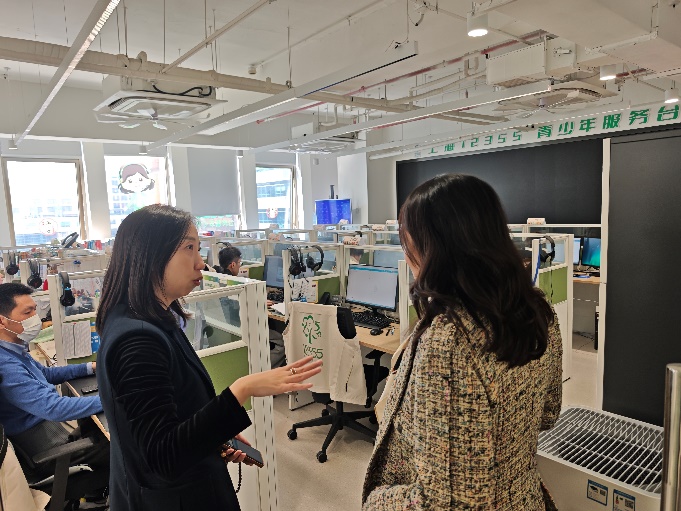 在上海12355总干事吴智惠的带领下,团队参观了服务中心的各功能区域,详细了解了其运作模式、服务项目以及在青少年心理援助、危机干预等方面取得的成效。
